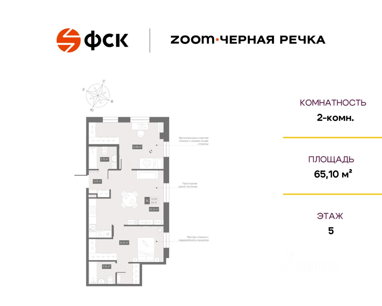 Цена со специальной скидкой в прямой продаже от застройщика — только в этом месяце. 2-к апартамент в комплексе класса бизнес-лайт Zoom Чёрная Речка на 5-м этаже. Общая площадь 65,1. Чистовая отделка.