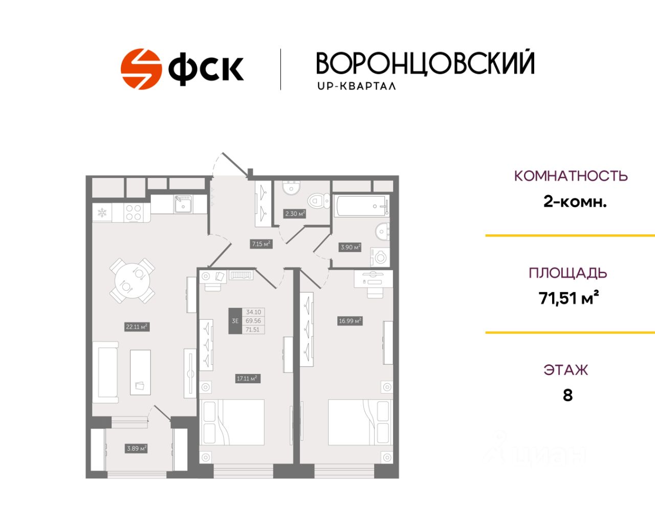 Цена со скидкой до 30% в прямой продаже от застройщика — только в этом месяце. Беспроцентная рассрочка. 2-к квартира в ЖК UP-квартал "Воронцовский" на 8-м этаже. Общая площадь 71,51. Чистовая отделка.