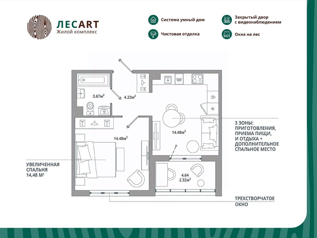 Продаётся 1-комнатная квартира 091, общей площадью 39.17 кв.м., на 8. Дом комфорт-класса, 12 этажей, в окружении леса и малоэтажной застройки. Проект с умным домом. Передача квартир в апреле 2026г.