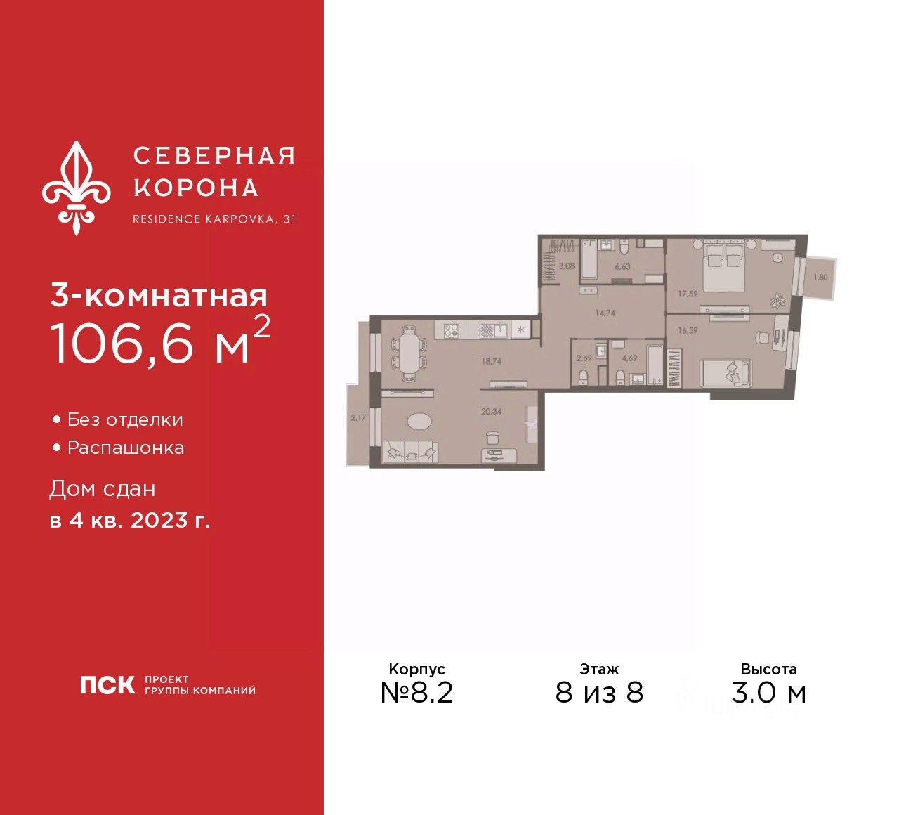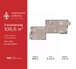 Продается 3-комн. квартира от застройщика в ЖК "Северная корона" на 8 этаже. Квартира без отделки, после получения ключей можно делать ремонт. Общая площадь: 106.6 кв.м., жилая: 54.52 кв.м., площадь просторной кухни-столовой: 18.74 кв.м. Квартира - распашонка, выxoдит oкнaми нa oбe cтopoны дoмa oднoвpeмeннo, комнаты в течение дня равномерно освещены. В квартире два балкона, два совмещенных и один раздельный санузел. Высота потолков 3.0 м.
