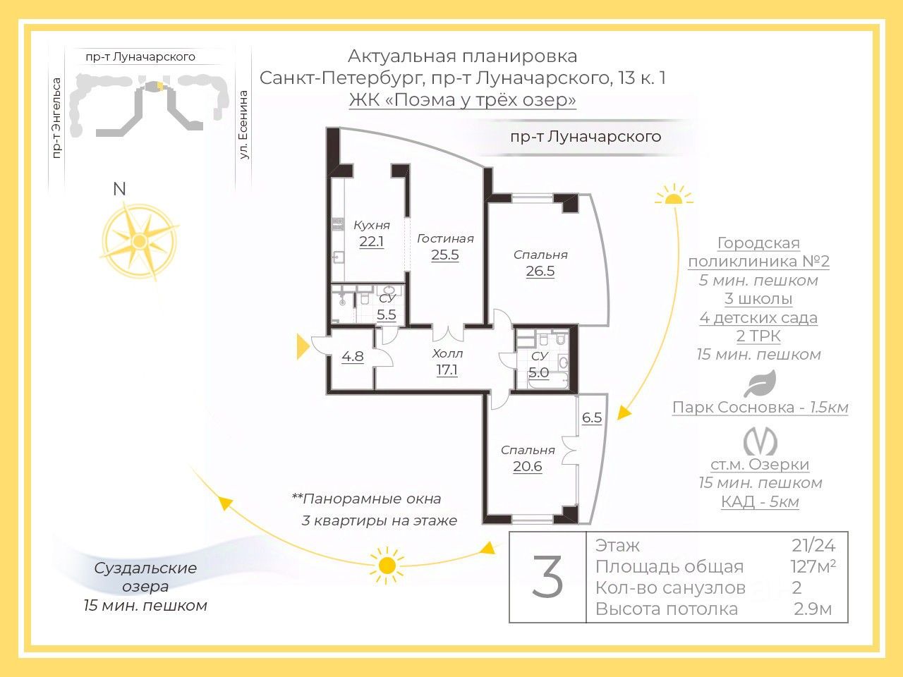 В пешей доступности Суздальские озера и парка Сосновка.