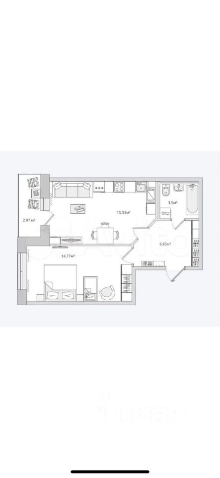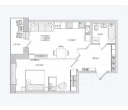 Жилая комната 14,5 кв.м. удобное расположение жилой комнаты и кухни.