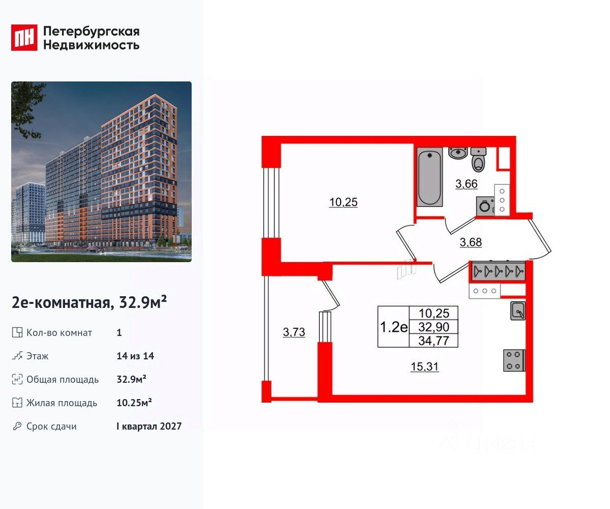 Удобная, классическая, функциональная европланировка, большая кухня-гостиная 15.31 м², вместительная прихожая 3.68 м². Общая площадь квартиры - 32.9 м², жилая 10.25 м², высота потолка 3 м.