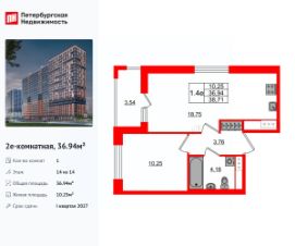 Удобная, классическая, функциональная европланировка, большая кухня-гостиная 18.75 м², вместительная прихожая 3.88 м². Общая площадь квартиры - 36.94 м², жилая 10.25 м², высота потолка 3 м.