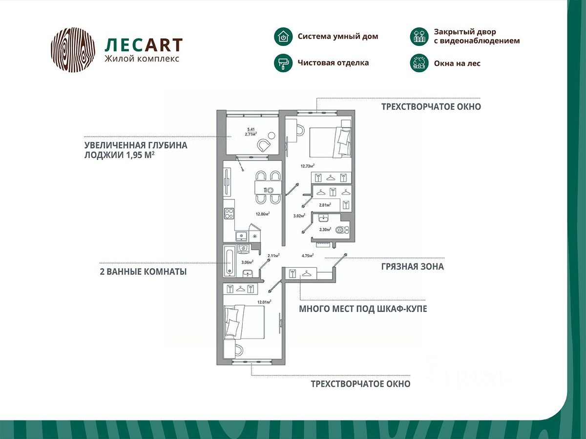 Продаётся 2-комнатная квартира 132, общей площадью 58.36 кв.м., на 9. Дом комфорт-класса, 12 этажей, в окружении леса и малоэтажной застройки. Проект с умным домом. Передача квартир в апреле 2026г.