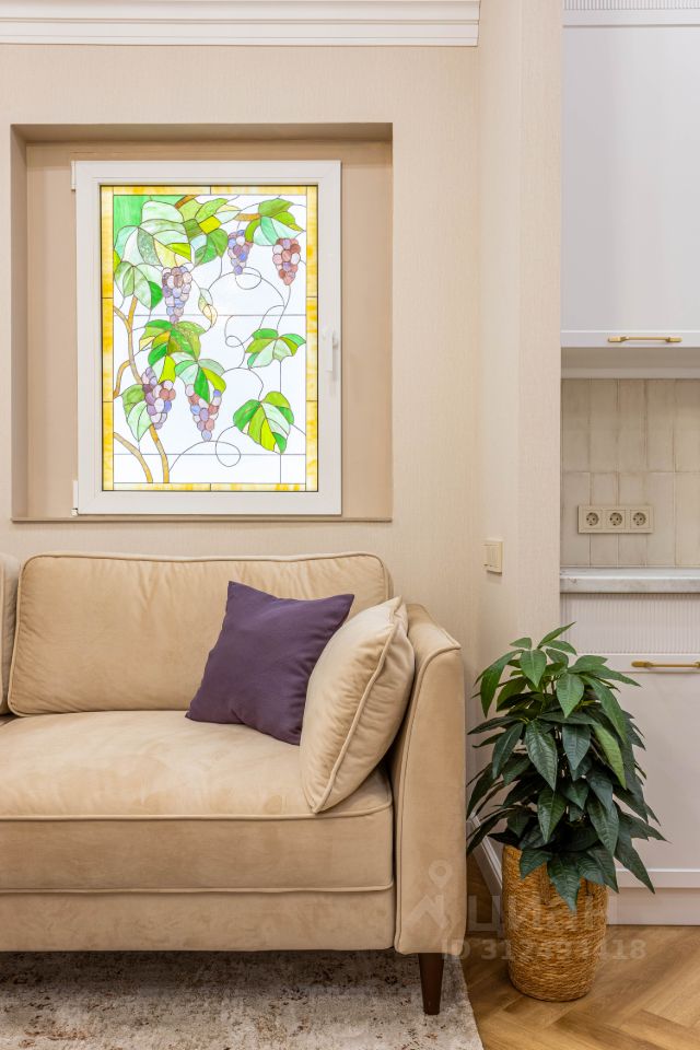 - просторная кухня-гостиная площадью 26,4 кв. м станет любимым местом для семейных ужинов и дружеских посиделок. Ярким и бесподобным акцентом гостиной будет витраж, изготовленный по индивидуальному заказу витражистом, членом Союза художников Санкт-Петербурга;