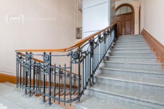 Парадная с гранитной лестницей и остатками витражной росписи создаёт атмосферу, которая моментально переносит в эпоху расцвета Петербурга. Также в доме установлен лифт.