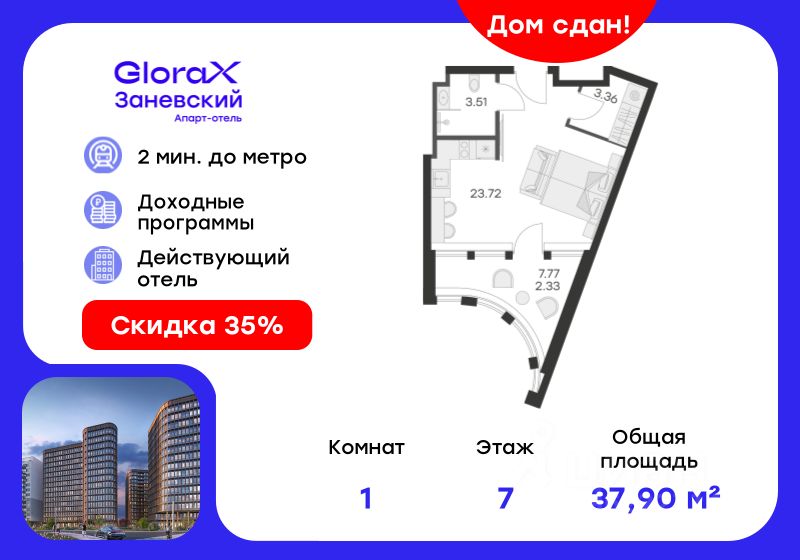 Продается апартамент-студия на 7-м этаже в сданном Апарт-комплексе бизнес-класса "GloraX Заневский". Ключи сразу! Общая площадь лота составляет 32,92 кв. м, из которых 23,72 кв. м отведено под жилую. Номер апартамента - 701.