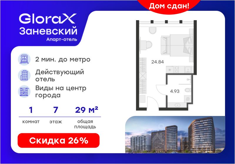 Продается апартамент-студия на 7-м этаже в сданном Апарт-комплексе бизнес-класса "GloraX Заневский". Ключи сразу! Общая площадь лота составляет 29,77 кв. м, из которых 24,84 кв. м отведено под жилую. Номер апартамента - 708.