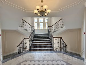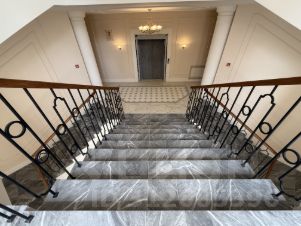 Интерьер лобби выполнен в неоклассическом стиле. Полы покрыты керамогранитом, стены облицованы штукатуркой и зеркалами. Красивая парадная лестница с деревянными перилами.