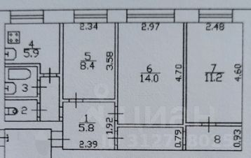 Самая большая комната в квартире - 14 м2., общая площадь - 53,7 м2.