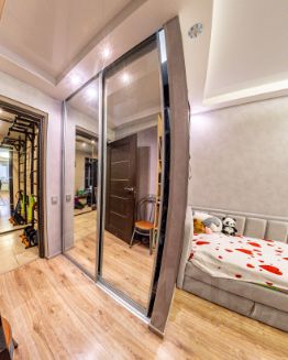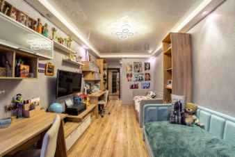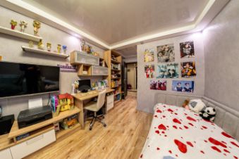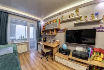 Ремонт выполнен с разводкой электрики и инженерной сантехники. Натяжные потолки во всей квартире. Заменены все двери и ламинат. В детской комнате оборудована гардеробная.