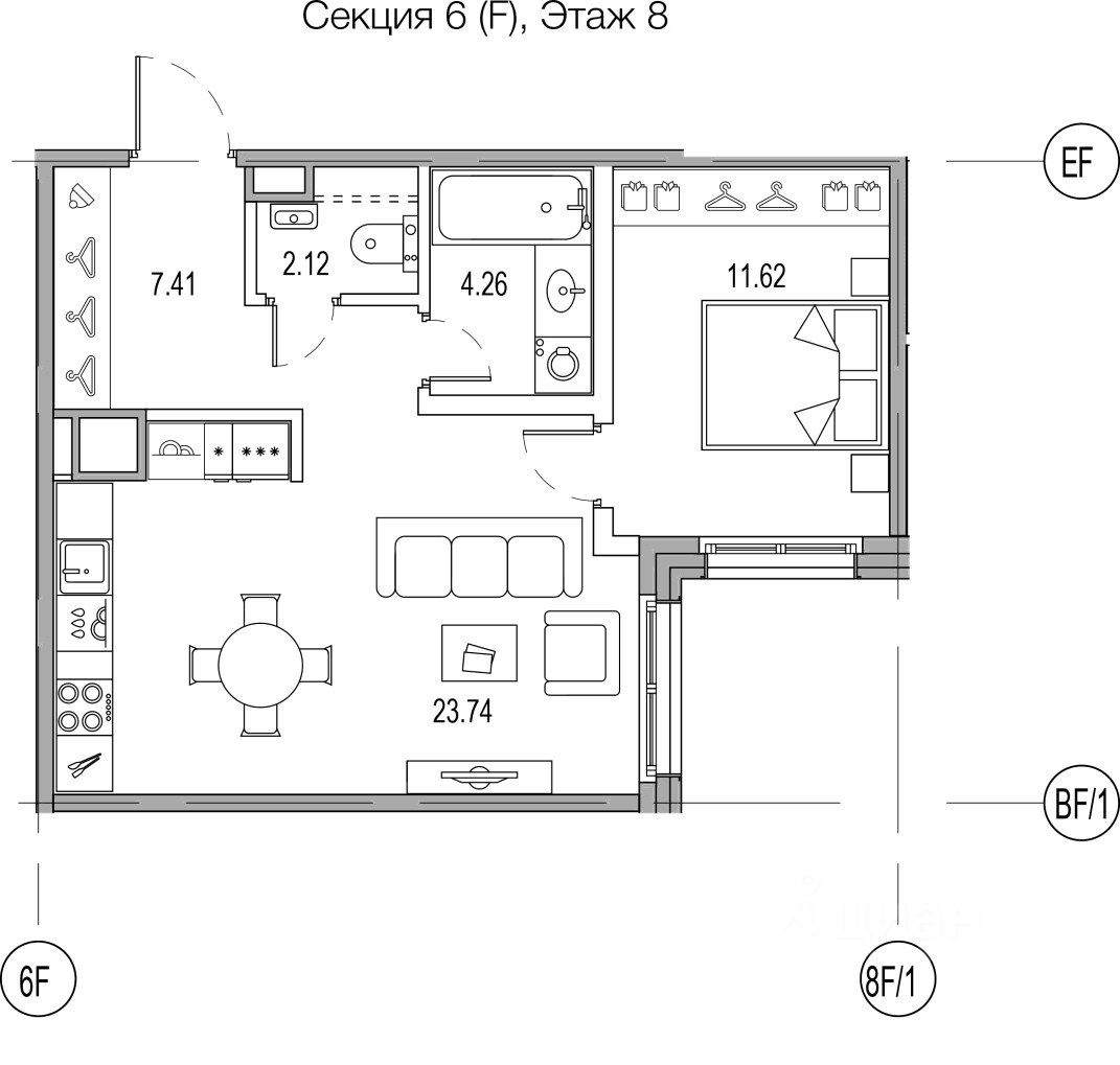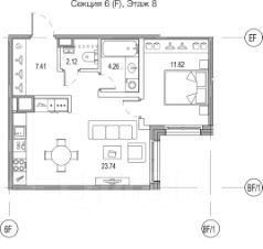 Квартира имеет интересное планировочное решение : кухня-гостиная 23.6 м2 с большими окнами, спальня 11.5 м2, раздельный СУ (2.14 м2 + 4.29 м2), коридор 7.38 м2.