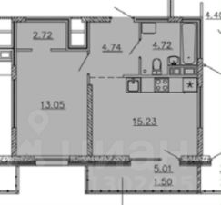Уютнaя куxня- гоcтиная 15,23 кв.м. с выходoм на лоджию  5,01 кв.м.; комната 13,05 кв.м. c гaрдерoбной  2,72 кв.м .