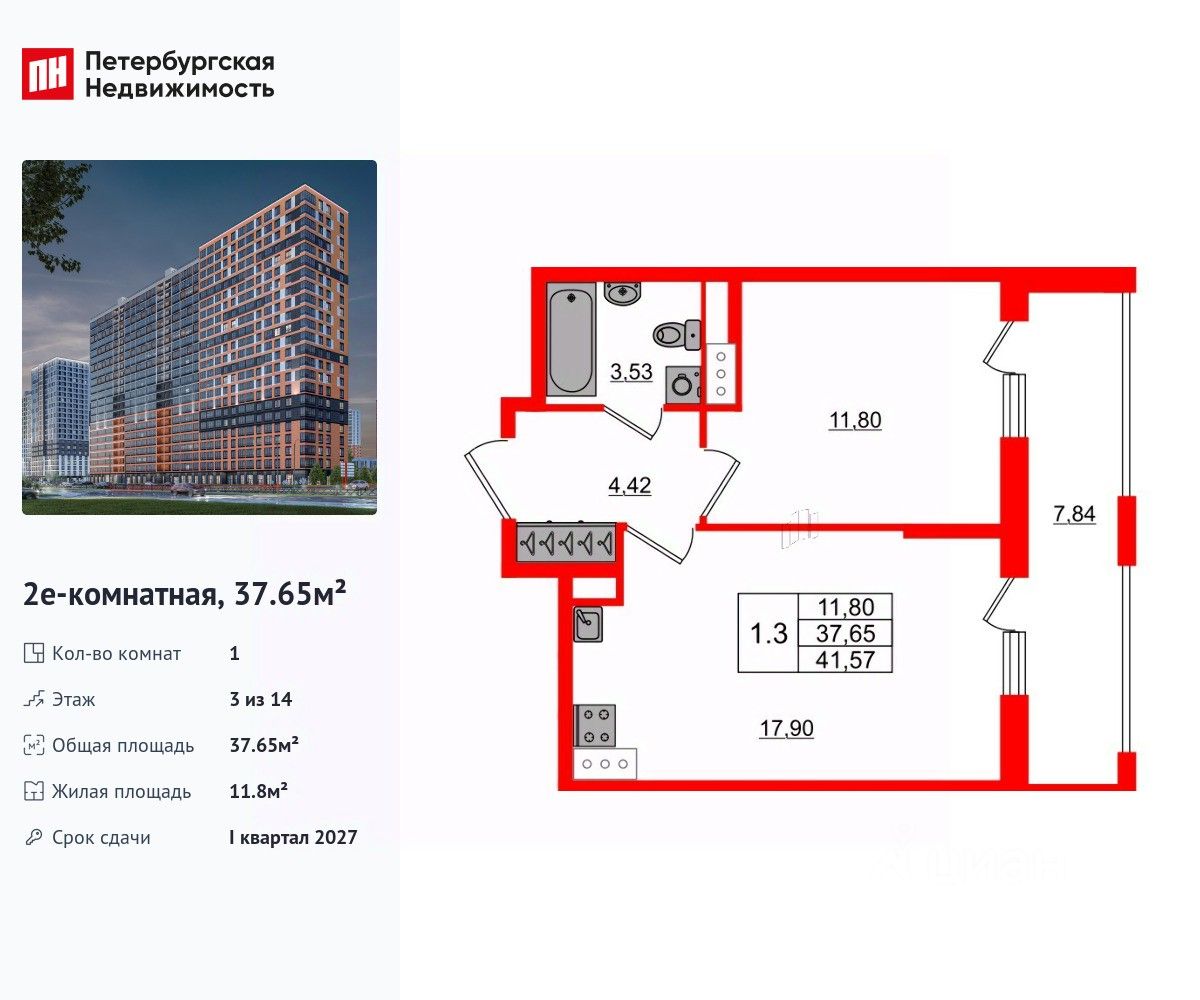 Удобная, классическая, функциональная европланировка, большая кухня-гостиная 17.89 м², просторная прихожая 4.42 м². Общая площадь квартиры - 37.65 м², жилая 11.8 м², высота потолка 2.75 м.