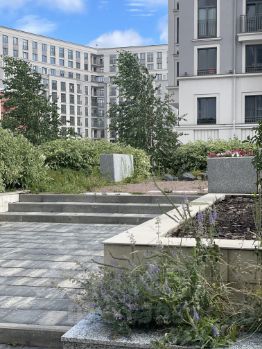 Закрытый двор, на территории расположена собственная школа с бассейном и детский сад, благоустроены места для отдыха, прогулочные аллеи, детские и спортивные площадки.