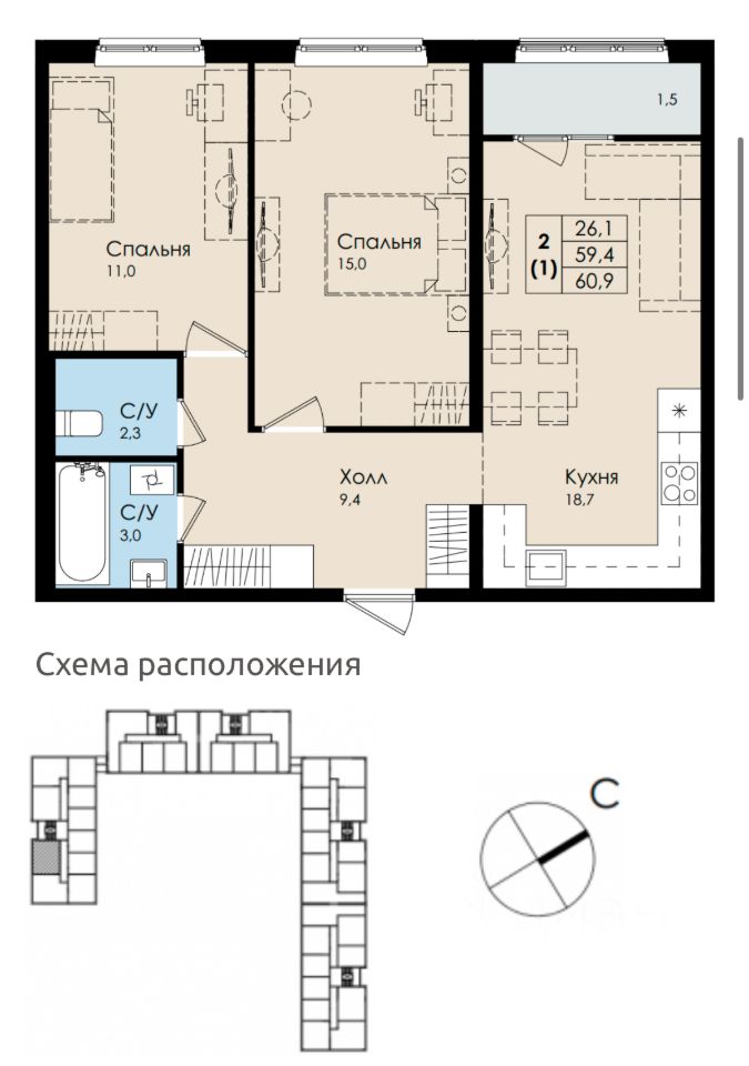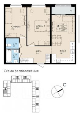 Плoщадь: 60,9 м² (жилaя 26,1 м², куxня 18,7 м²).