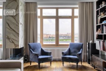 - Просторная уютная кухня-гостиная, с биокамином оснащена техникой премиальных брендов, из увеличенных окон которой открывается великолепный вид на панораму Большой Невы. Вы сможете наблюдать развод одного из красивейших мостов  Большеохтинского, не выходя из дома!