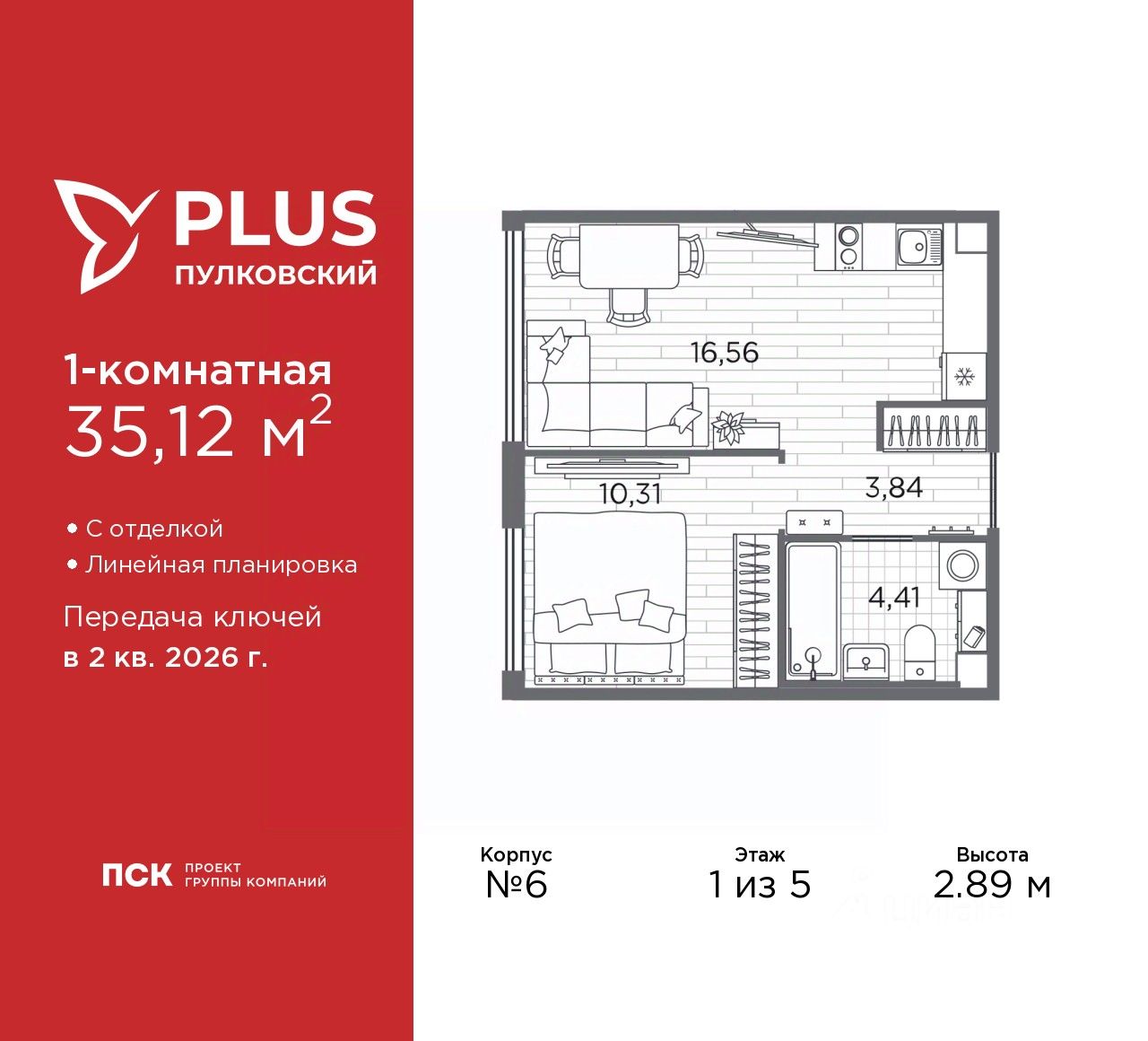 Однокомнатная квартира от застройщика с отделкой в ЖК "PLUS Пулковский" на 1 этаже. Общая площадь: 35.12 кв.м., жилая: 10.31 кв.м., площадь просторной кухни-столовой: 16.56 кв.м. Все окна выходят на одну сторону. В квартире один совмещенный санузел. Высота потолков 2.89 м.
