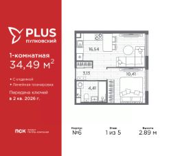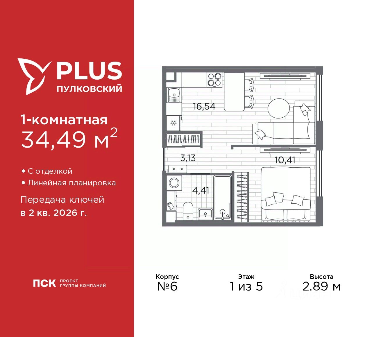 Просторная 1-комн. квартира с отделкой в ЖК "PLUS Пулковский" на 1 этаже. Общая площадь: 34.49 кв.м., жилая: 10.41 кв.м., площадь просторной кухни-столовой: 16.54 кв.м. Все окна выходят на одну сторону. В квартире один совмещенный санузел. Высота потолков 2.89 м.