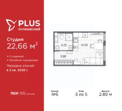 Просторная 1-комн. квартира-студия с отделкой в ЖК "PLUS Пулковский" на 5 этаже. Общая площадь: 22.66 кв.м., площадь гостиной 14.55 кв.м., из которых 5 кв.м. выделено под кухонную зону. Все окна выходят на одну сторону. В квартире один совмещенный санузел. Высота потолков 2.89 м.