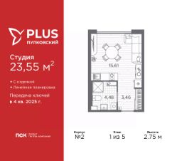Продается 1-комн. квартира-студия с отделкой в ЖК "PLUS Пулковский" на 1 этаже. Общая площадь: 23.55 кв.м., площадь гостиной 15.61 кв.м., из которых 5 кв.м. выделено под кухонную зону. Все окна выходят на одну сторону. В квартире один совмещенный санузел. Высота потолков 2.75 м.
