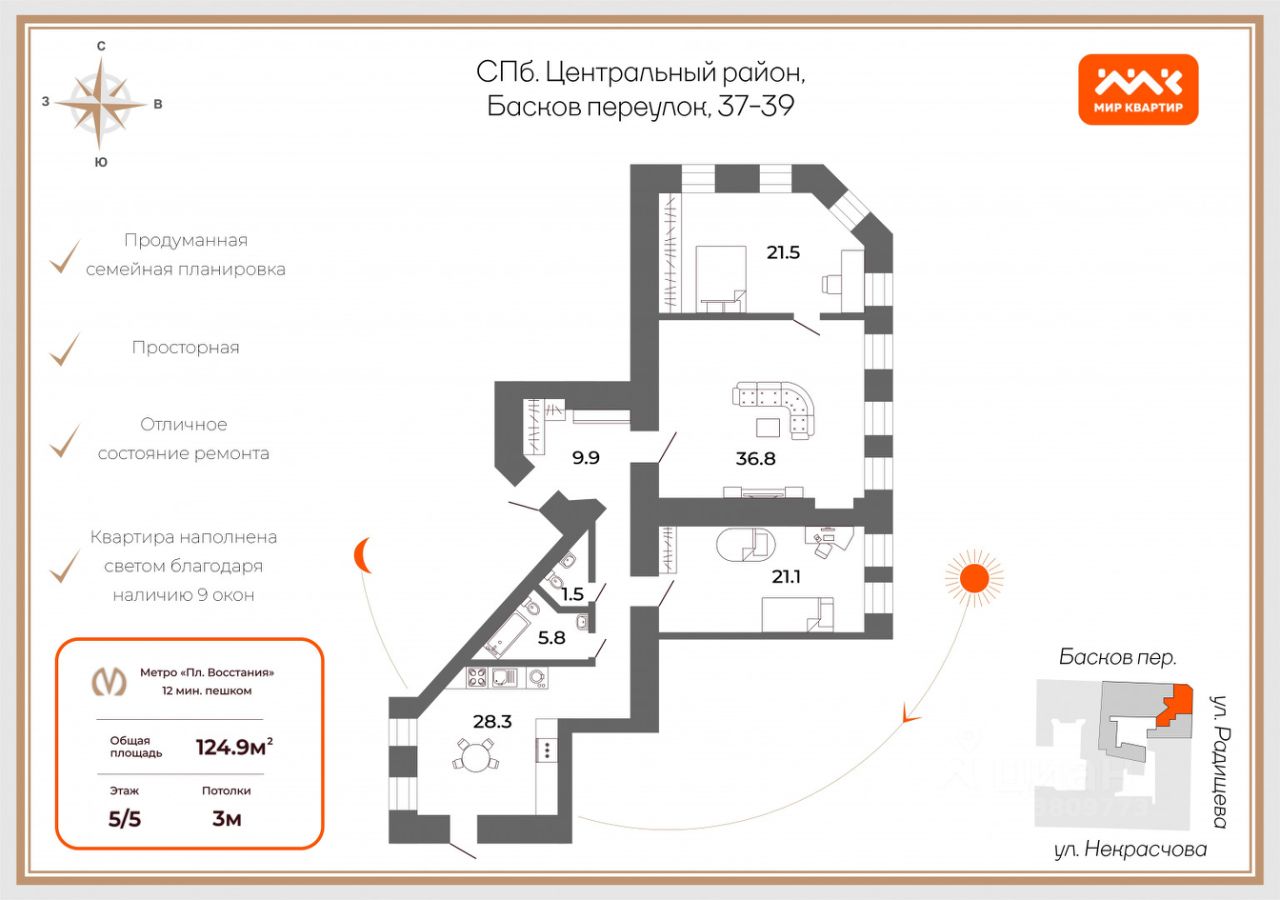 Арт. 93234525 Продается просторная квартира 124,9 м2 в центре Санкт-Петербурга - идеальное место для вашей семьи.