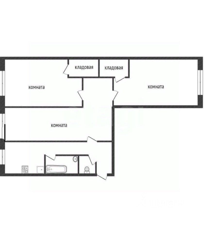 Главная комната проходная, остальные изолированные. В изолированных комнатах предусмотрены кладовки. Комнаты 17/12/10 м2. Кухня 6м2.