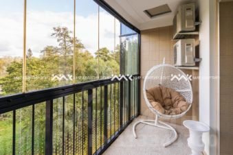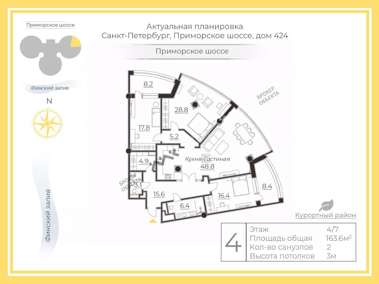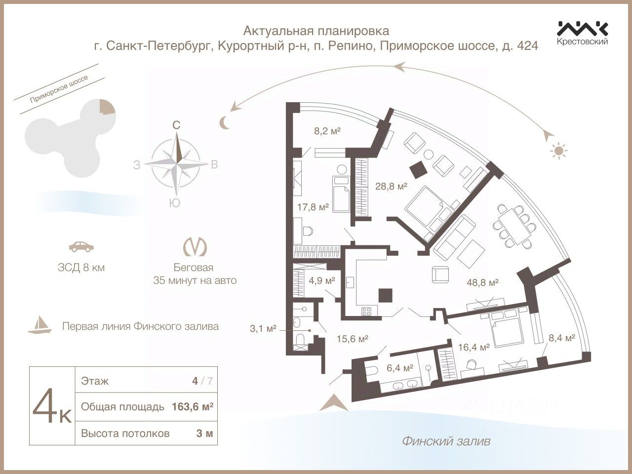 Апартаменты находятся на 4 этаже. Площадь 163 м². Из окон открывается потрясающий вид на хвойный лес и боковой вид на Финский залив.