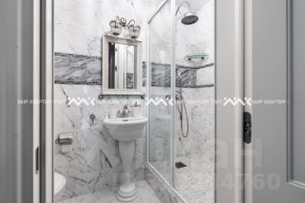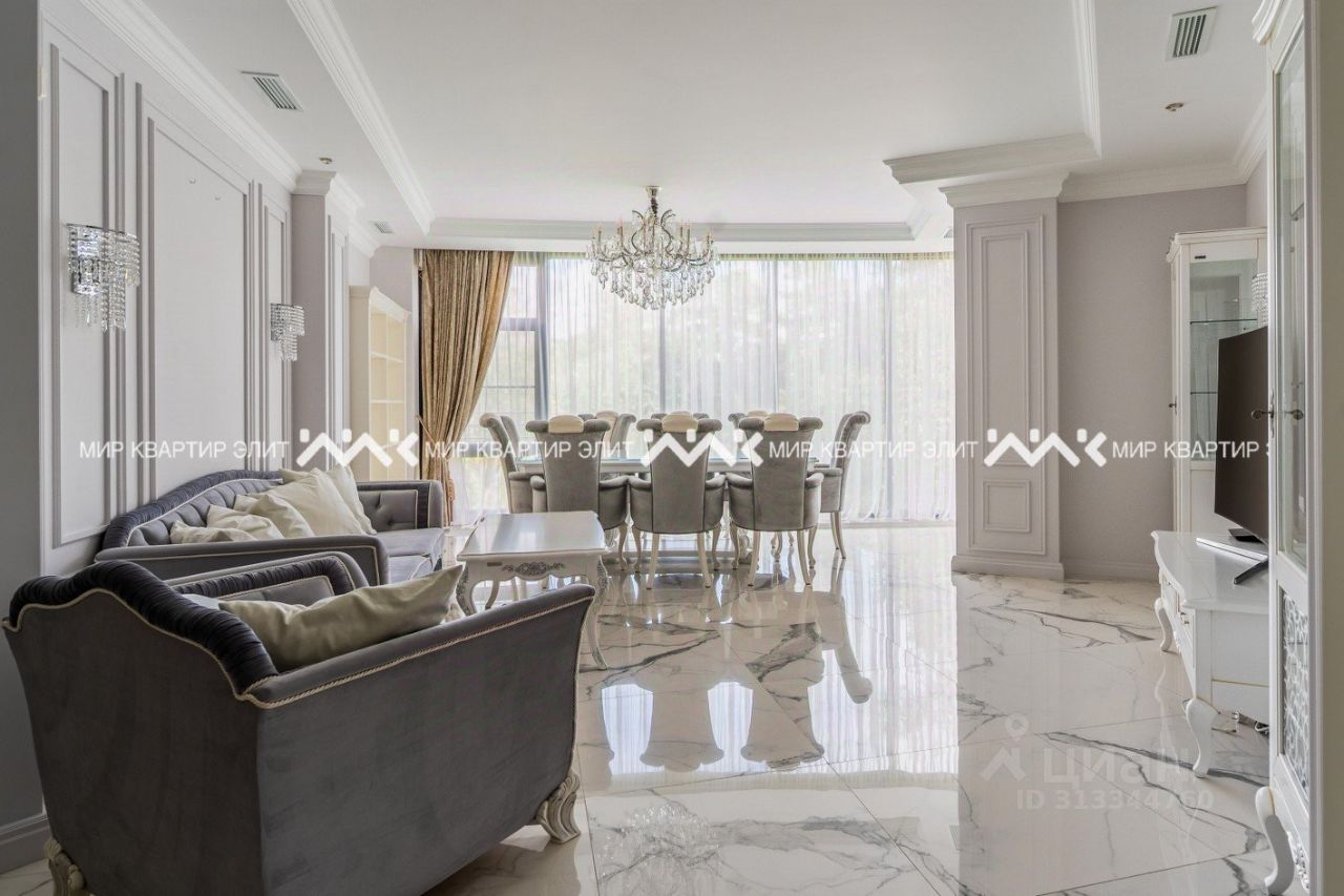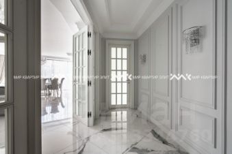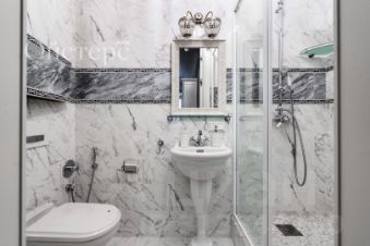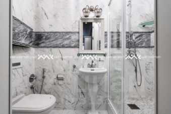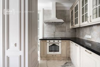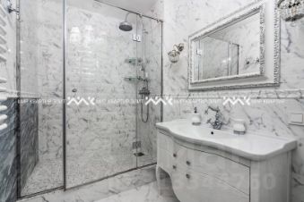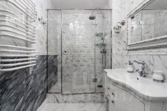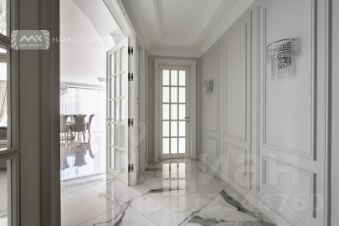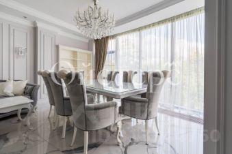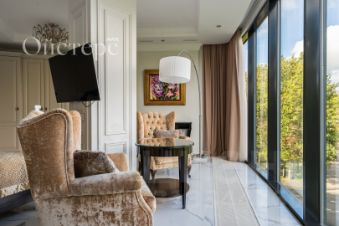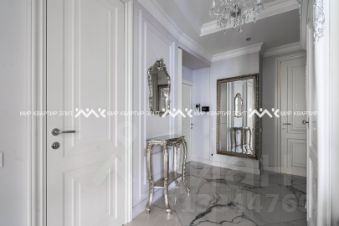 Интерьер апартаментов выполнен в неоклассическом стиле по индивидуальному дизайн-проекту. Мебель и двери от ведущих итальянских брендов, хрустальные люстры, гипсовые лепные зеркала создают единую гармоничную атмосферу. А светлые тона, большие окна в пол и трёхметровые потолки делают пространство ещё более воздушным и светлым.