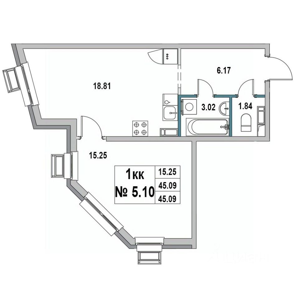 Общая площадь45,09 м²
