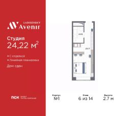 1-комн. апартаменты-студия от застройщика с отделкой в ЖК "Ladozhsky AVENIR" на 6 этаже. Общая площадь: 24.22 кв.м., площадь гостиной 20.16 кв.м., из которых 5 кв.м. выделено под кухонную зону. Все окна выходят на одну сторону. В апартаментах один совмещенный санузел. Высота потолков 2.7 м.