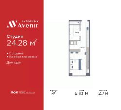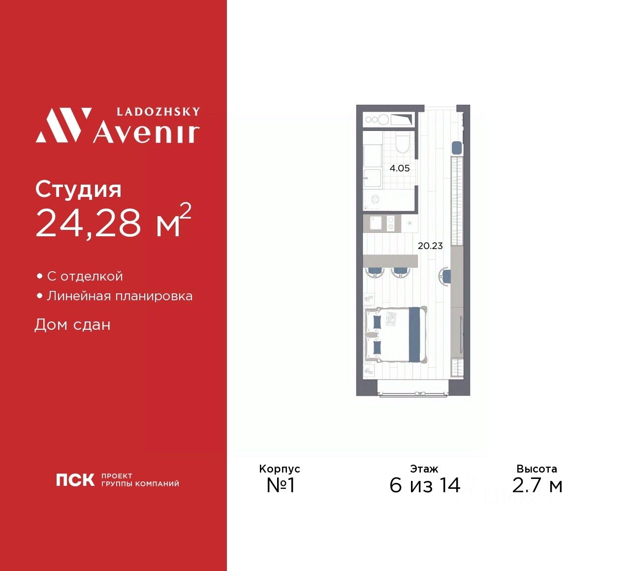 Просторные 1-комн. апартаменты-студия с отделкой в ЖК "Ladozhsky AVENIR" на 6 этаже. Общая площадь: 24.28 кв.м., площадь гостиной 20.23 кв.м., из которых 5 кв.м. выделено под кухонную зону. Все окна выходят на одну сторону. В апартаментах один совмещенный санузел. Высота потолков 2.7 м.