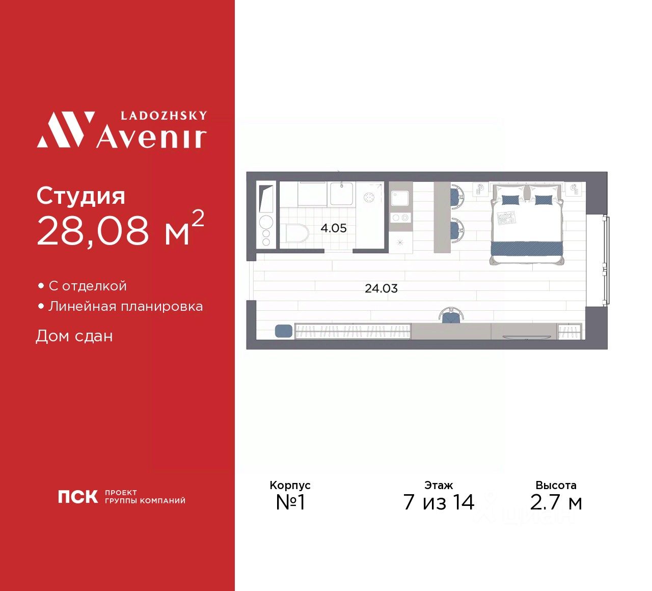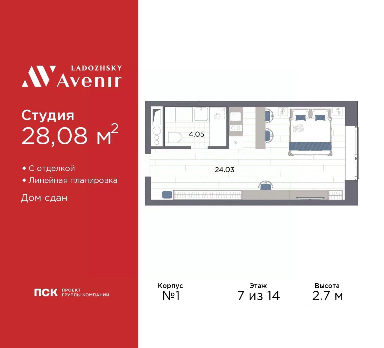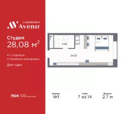 1-комн. апартаменты-студия от застройщика с отделкой в ЖК "Ladozhsky AVENIR" на 7 этаже. Общая площадь: 28.08 кв.м., площадь гостиной 24.03 кв.м., из которых 5 кв.м. выделено под кухонную зону. Все окна выходят на одну сторону. В апартаментах один совмещенный санузел. Высота потолков 2.7 м.