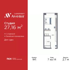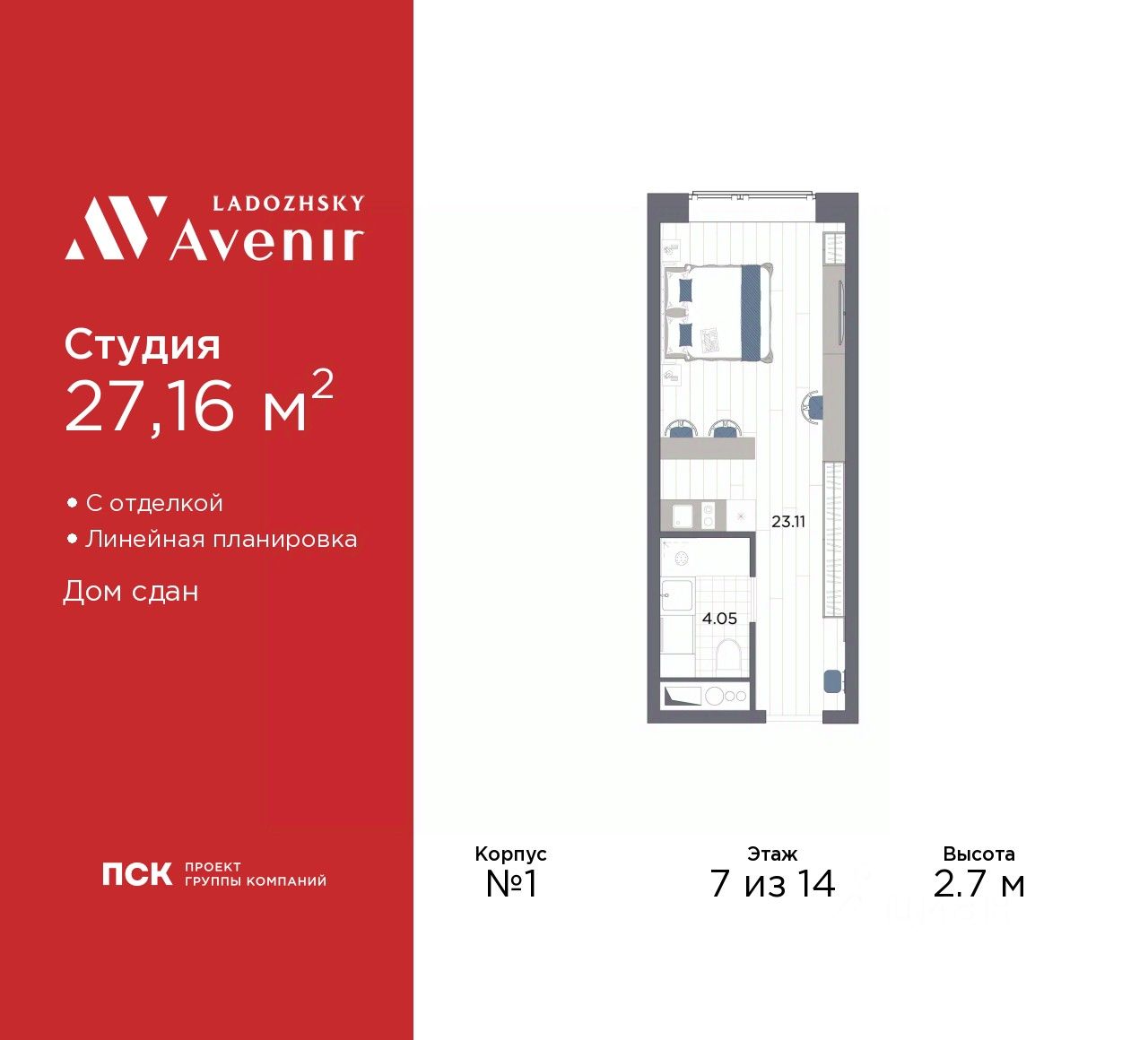 1-комн. апартаменты-студия от застройщика с отделкой в ЖК "Ladozhsky AVENIR" на 7 этаже. Общая площадь: 27.16 кв.м., площадь гостиной 23.11 кв.м., из которых 5 кв.м. выделено под кухонную зону. Все окна выходят на одну сторону. В апартаментах один совмещенный санузел. Высота потолков 2.7 м.