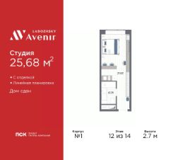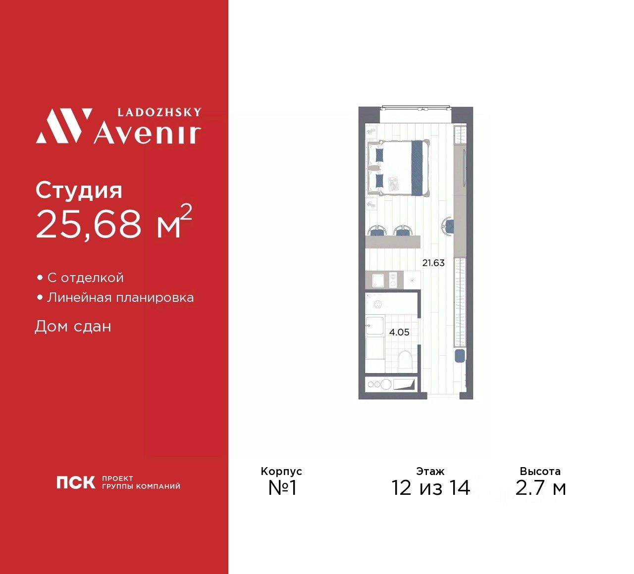 Просторные 1-комн. апартаменты-студия с отделкой в ЖК "Ladozhsky AVENIR" на 12 этаже. Общая площадь: 25.68 кв.м., площадь гостиной 21.63 кв.м., из которых 5 кв.м. выделено под кухонную зону. Все окна выходят на одну сторону. В апартаментах один совмещенный санузел. Высота потолков 2.7 м.