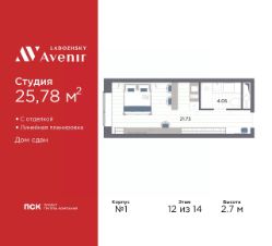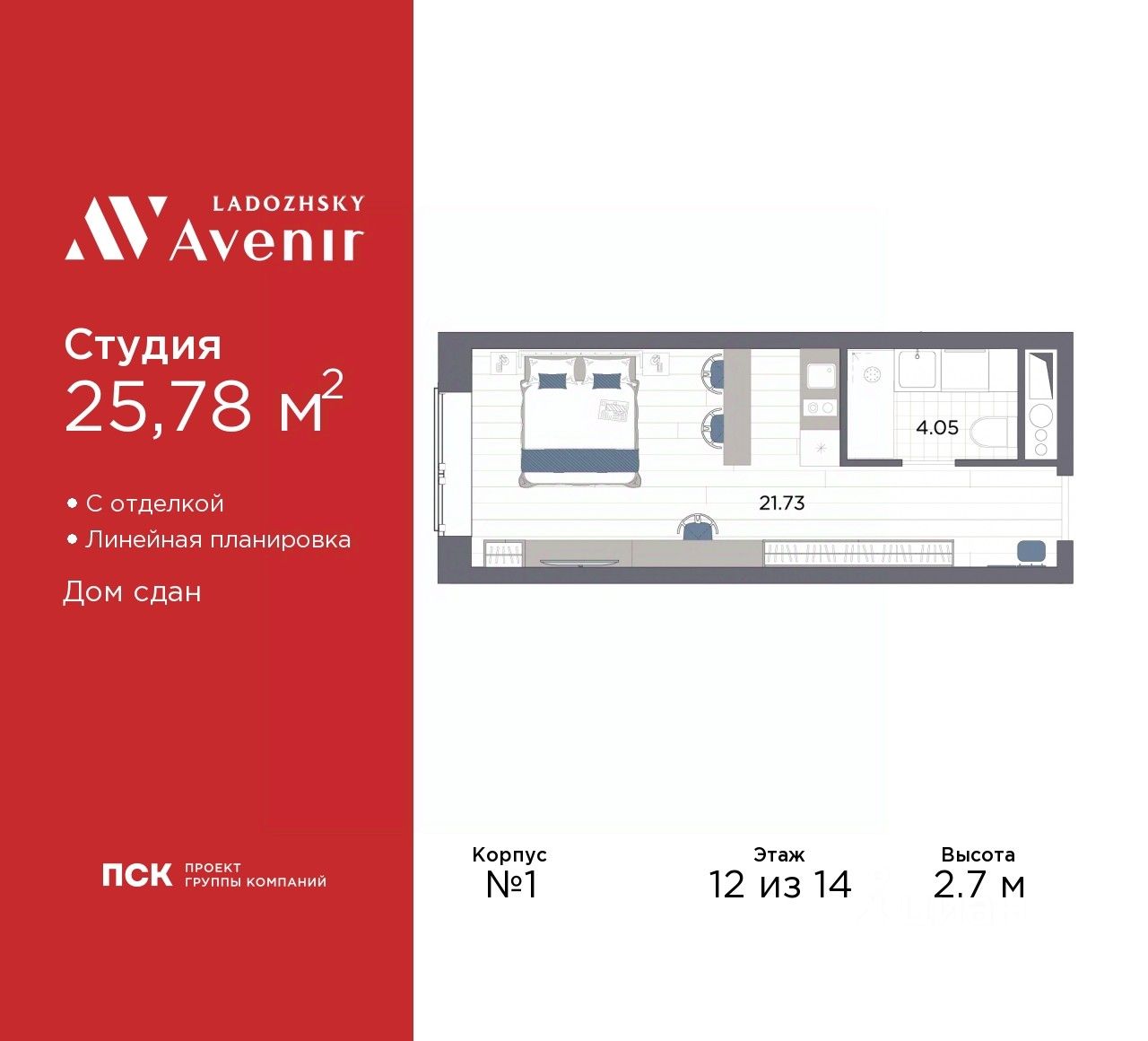 1-комн. апартаменты-студия с отделкой в ЖК "Ladozhsky AVENIR" на 12 этаже. Общая площадь: 25.78 кв.м., площадь гостиной 21.73 кв.м., из которых 5 кв.м. выделено под кухонную зону. Все окна выходят на одну сторону. В апартаментах один совмещенный санузел. Высота потолков 2.7 м.