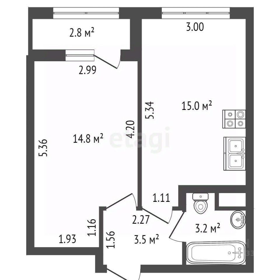Общая площадь квартиры: 38.9 м² (из которой жилая площадь составляет 14.8 м²)