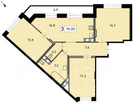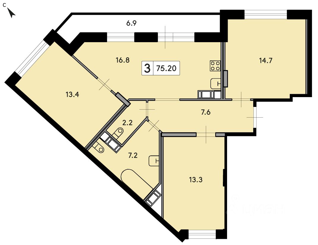 Продается просторная 3-комнатная квартира в новом экологичном ЖК. Оригинальная планировка, просторная лоджия, два санузла.