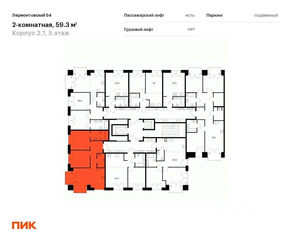 Продаётся 2-комн. квартира площадью 59,3 кв.м на 5 этаже 7 этажного дома (Корпус 2.1, Секция 1) проекта ПИК Лермонтовский 54. Светлый просторный подъезд на уровне земли, функциональная планировка, большие окна, без отделки.