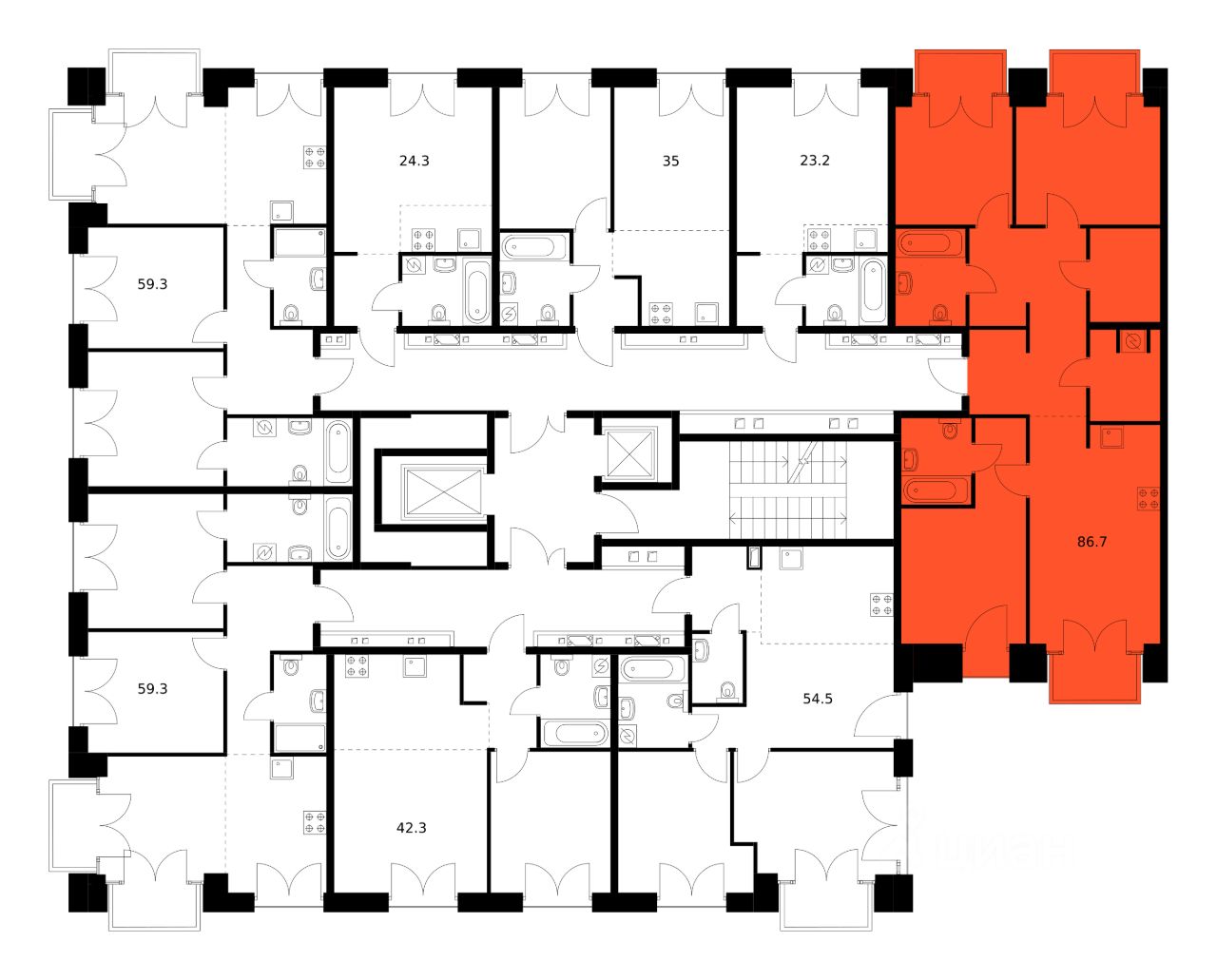 Продаётся 3-комн. квартира площадью 86,7 кв.м на 5 этаже 7 этажного дома (Корпус 2.1, Секция 1) проекта ПИК Лермонтовский 54. Светлый просторный подъезд на уровне земли, функциональная планировка, большие окна, без отделки.