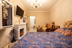 - В комнате 16.1м2 все функционально - есть и кровать с ортопедическим матрасом и подъемных механизмом, и есть также диван, камин, телевизор и журнальный столик;
