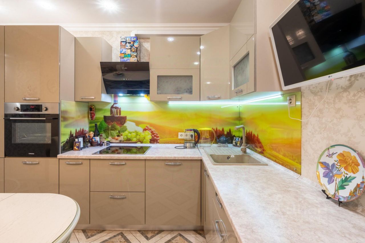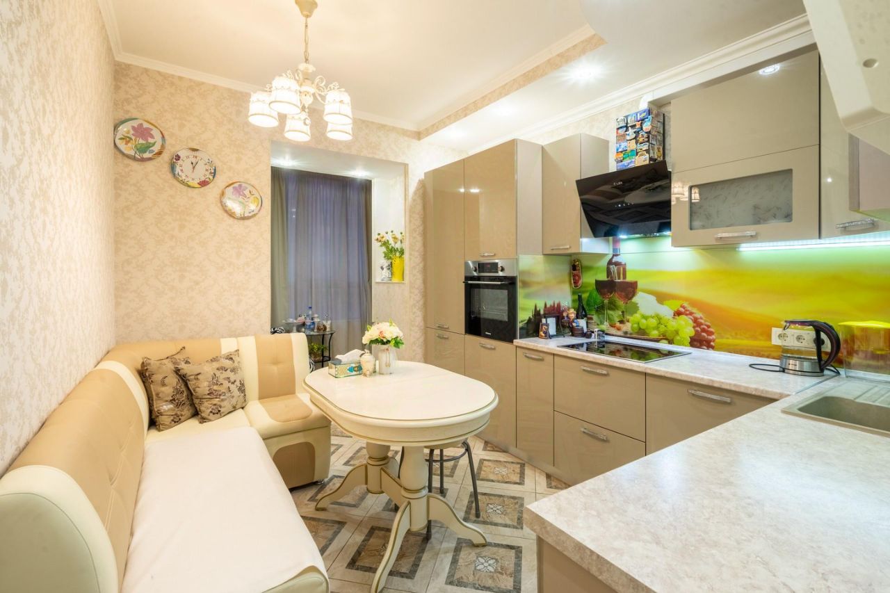 - Кухня оснащена всей необходимой бытовой техникой: встроенный холодильник, духовой шкаф, варочная поверхность, посудомоечная машина, вытяжка, телевизор;