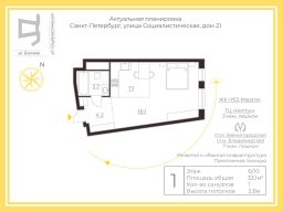 Студия 33,1м.кв. находится на высоком 6 этаже. Произведена отделка от застройщика с санузлом и кухонной зоной, а также было установлено кондиционировано.