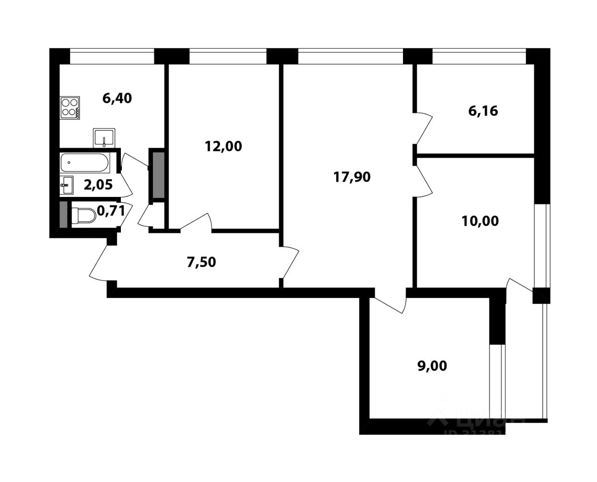 Комнаты: 17,9+10,0+9,0+12+6,16 кв.м;