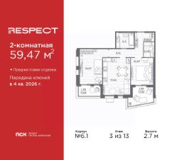 2-комн. квартира с предчистовой отделкой в ЖК "RESPECT" на 3 этаже. Общая площадь: 59.47 кв.м., жилая: 25.34 кв.м., площадь просторной кухни-столовой: 17.44 кв.м. Квартира угловая, идеально подойдет любителям тишины и панорамных видов. В квартире две лоджии, один совмещенный и один раздельный санузел. Высота потолков 2.7 м.