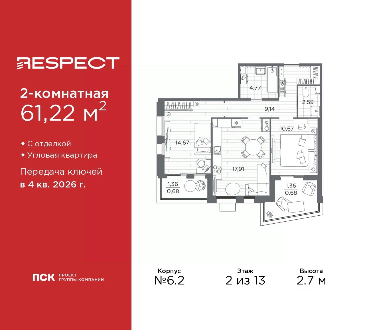 Просторная двухкомнатная квартира с отделкой в ЖК "RESPECT" на 2 этаже. Общая площадь: 61.22 кв.м., жилая: 25.34 кв.м., площадь просторной кухни-столовой: 17.91 кв.м. Квартира угловая, очень светлая, естественная вентиляция при открытии окон. В квартире две лоджии, один совмещенный и один раздельный санузел. Высота потолков 2.7 м.