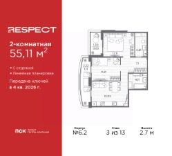 Просторная 2-комн. квартира с отделкой в ЖК "RESPECT" на 3 этаже. Общая площадь: 55.11 кв.м., жилая: 23.32 кв.м., площадь просторной кухни-столовой: 15.05 кв.м. Комнаты изолированные, все окна выходят на одну сторону. В квартире один балкон и одна лоджия, два совмещенных санузла. Терраса представляет собой роскошную зону отдыха для проведение вечеров в кругу семьи и друзей или организация вечеринок. Высота потолков 2.7 м.