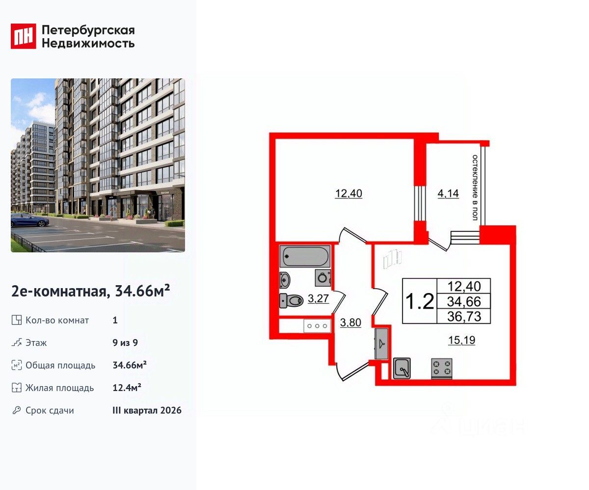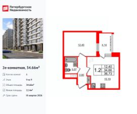 Удобная, классическая, функциональная европланировка, большая кухня-гостиная 15.19 м², вместительная прихожая 3.8 м². Общая площадь квартиры - 34.66 м², жилая 12.4 м², высота потолка 3 м.