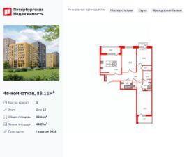 Уникальная, функциональная европланировка, большая кухня-гостиная 18.05 м², просторная прихожая 13.61 м². Общая площадь квартиры - 88.11 м², жилая 44.09 м², высота потолка 2.77 м.